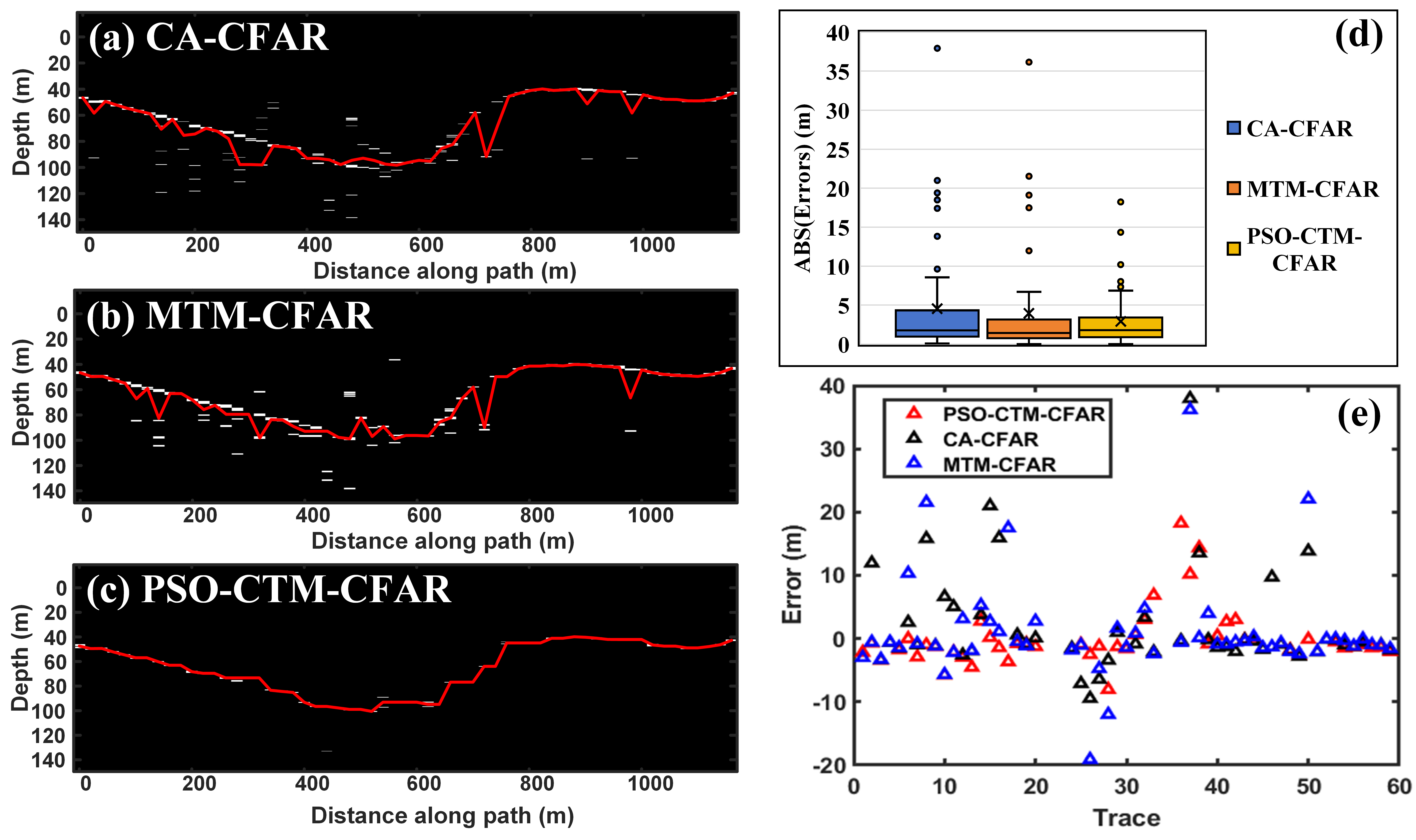 (a)-(c)23k冰川47测线冰岩界面起伏特征;(d)-(e)3种基于CFAR的方法的测量误差对比
