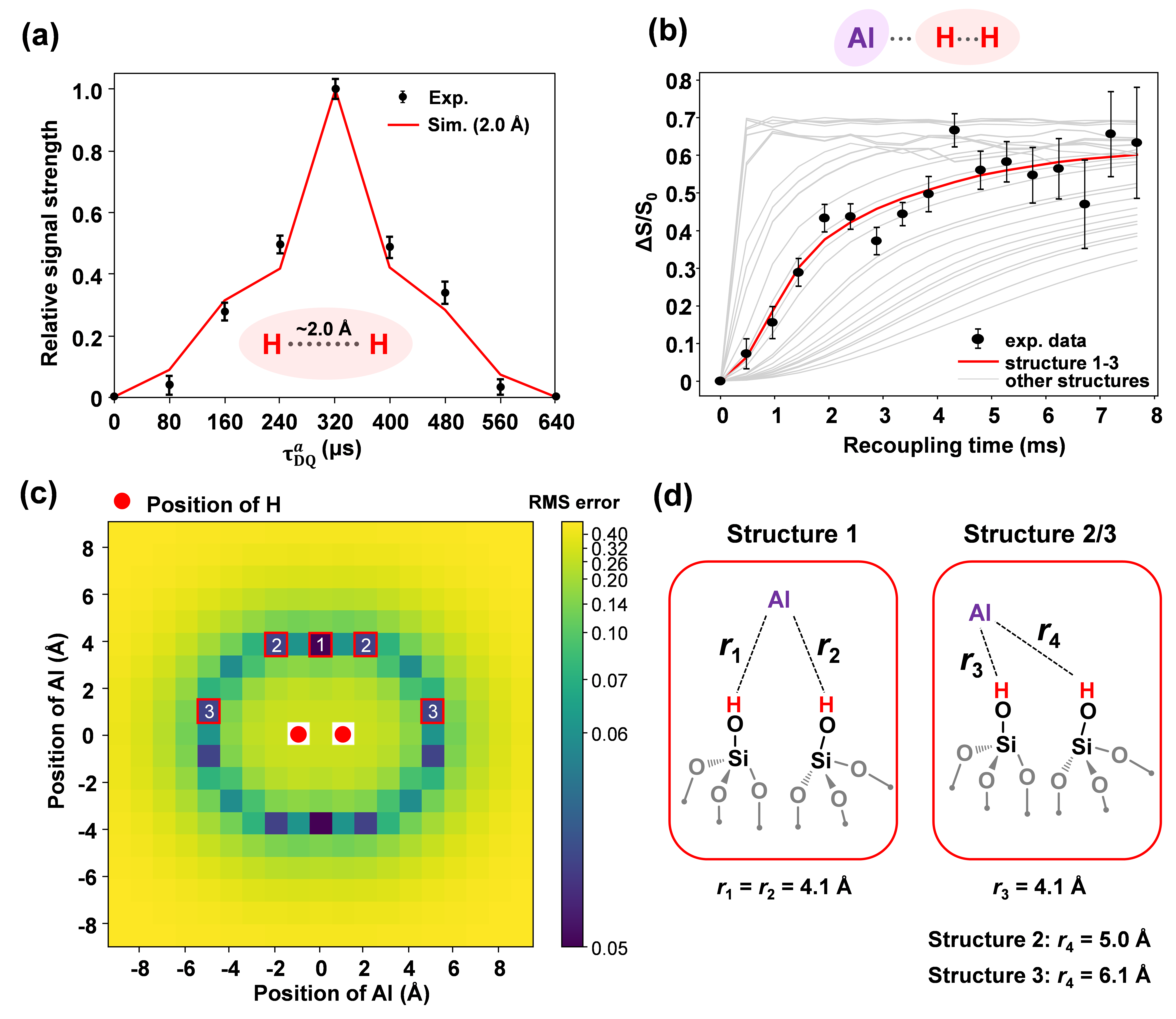 图2. 经水热处理的无定形氧化硅-氧化铝中“伪桥式羟基对”的核间距离测量;(a) 恒时演化1H-1H f-DQ/SQ 实验及拟合;(b) 1H-{27Al} S-RESPDOR实验及拟合; (c) 1H-{27Al} S-RESPDOR 实验数据与自旋动力学模拟结果的均方根误差;(d) 根据 NMR/DFT 结果提出的两种最可能的伪桥式羟基对结构模型