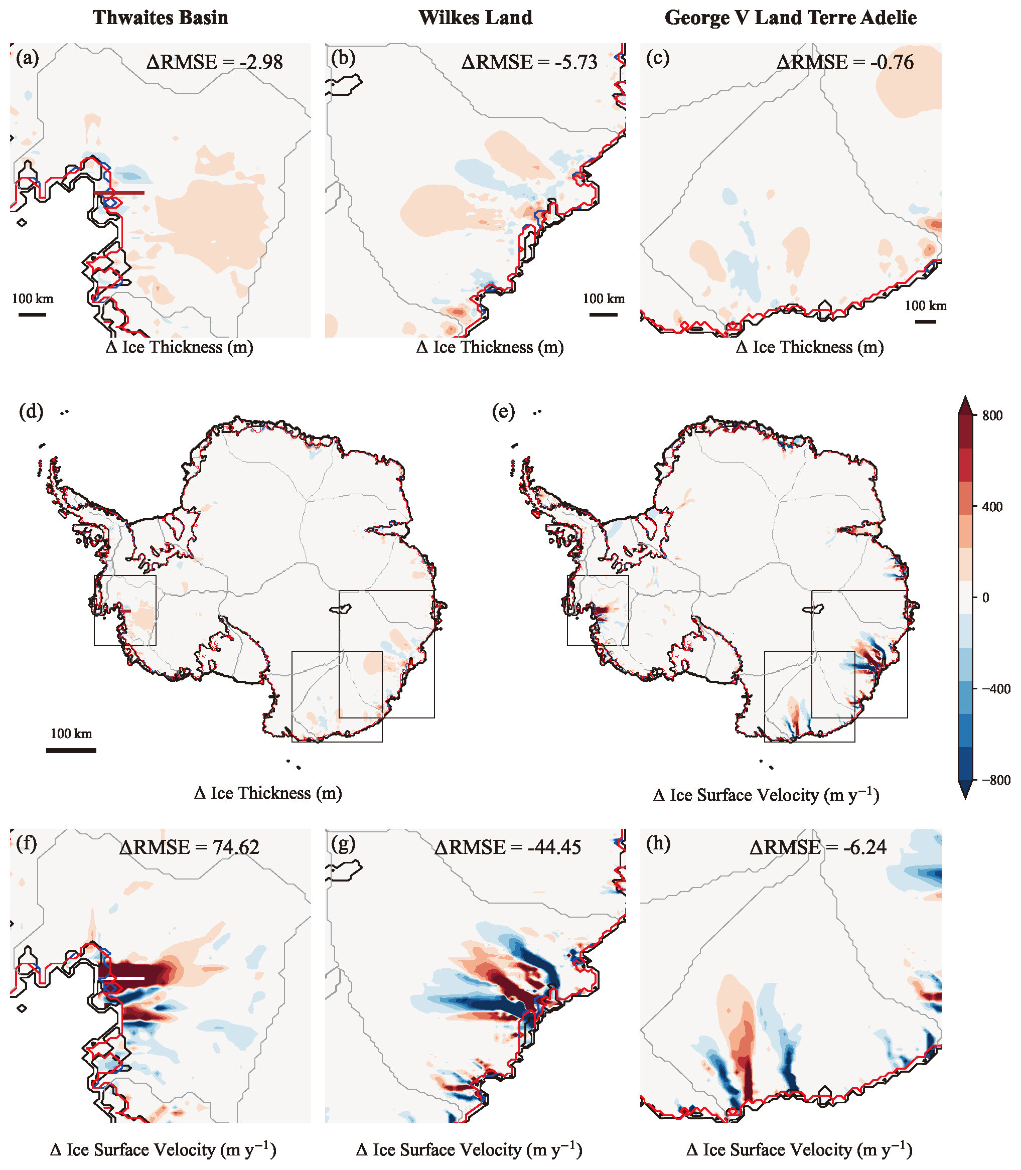 S1与S2的冰厚度和流速残差对比;(a-c)分别为TB、WL和GVL区域的冰厚度差异,(f-h)对应上述三个区域的冰表面流速残差;(d)和(e)表示两次模拟结果冰厚度与表面流速的整体偏差(S1-S2);红线与蓝线分别表示S1和S2的接地线位置,黑线表示接地线观测值
