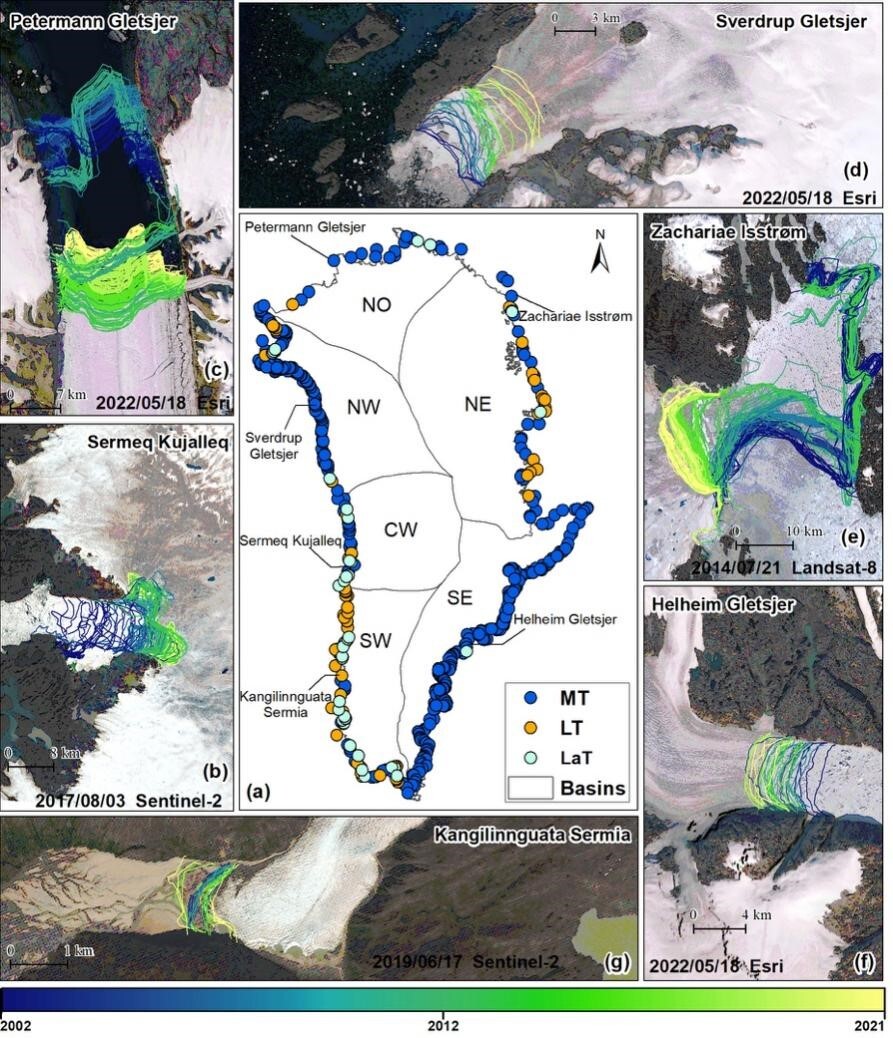 格陵兰冰川末端数据集(GrTPD)空间分布及典型前缘变化示例