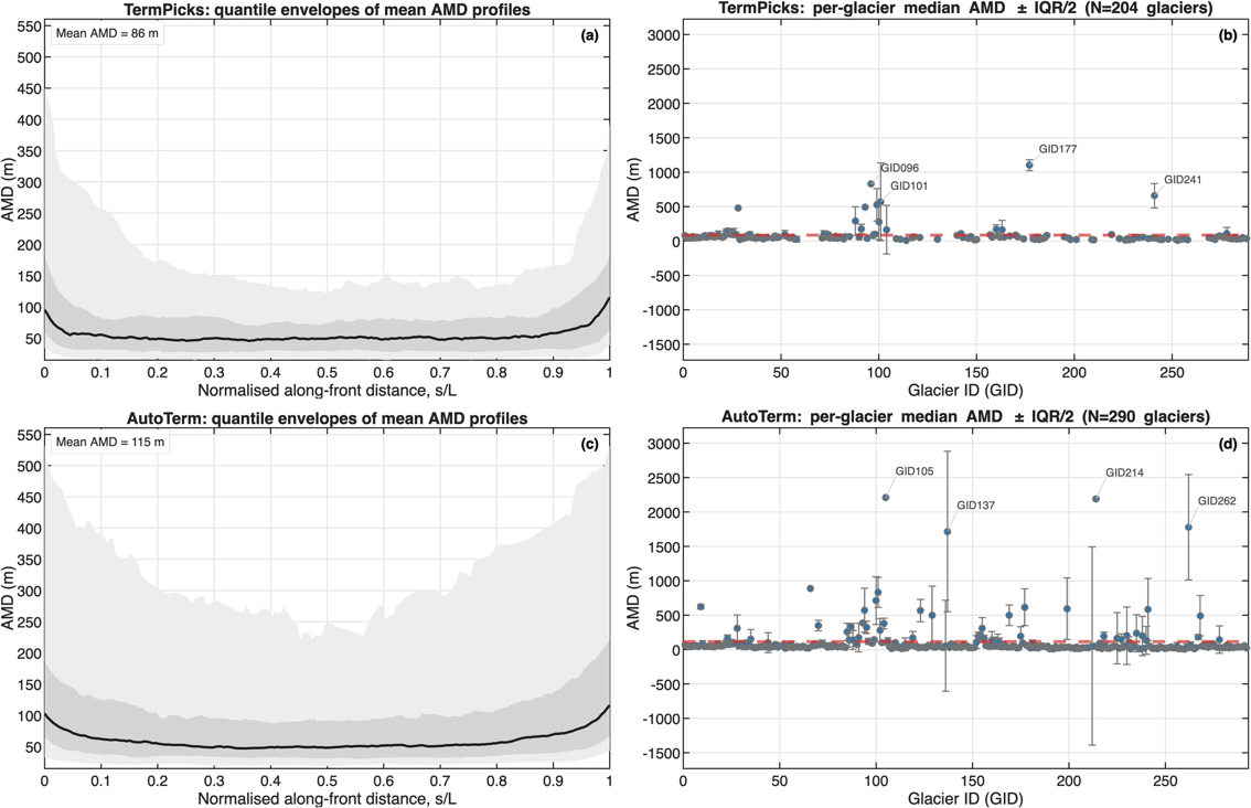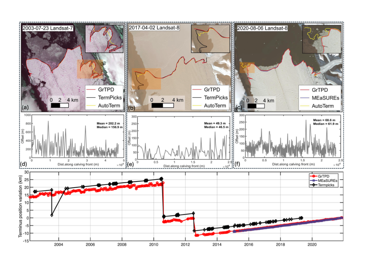 研究团队整合Landsat、Sentinel-1/2、MODIS、ENVISAT、ASTER和ERS等多源卫星遥感影像数据,构建了覆盖近二十年的高时空分辨率冰川前缘记录。通过统一的标准化流程、人工解译与严格质量控制,显著提升了数据的一致性与精度。在精度验证方面,研究团队将GrTPD与国际主流数据产品进行系统对比。结果表明:GrTPD 和人工标注数据集 TermPicks 相比,平均最小距离误差(AMD)为86 米;和自动化产品 AutoTerm 相比,平均最小距离误差(AMD)为115米。整体来看,GrTPD表现出较高的位置精度与稳定性(图2)。在多冰川、多时间尺度对比中,GrTPD与人工数据TermPicks一致性更高(图3),而自动化方法在复杂观测条件下误差更为显著,进一步体现了该数据集作为高质量基准数据的可靠性。