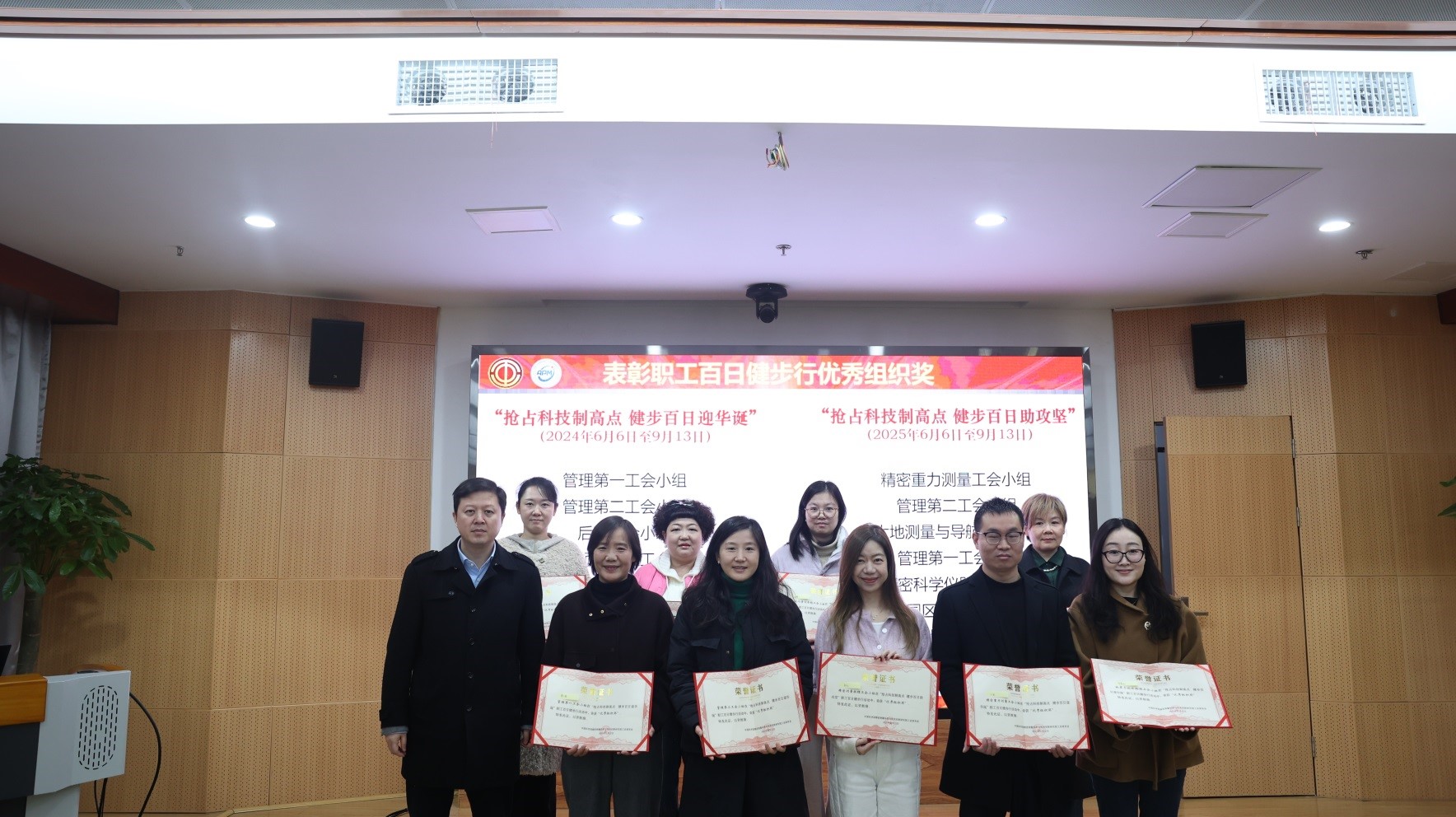 院长周欣,党委书记、副院长柳晓军为工会工作积极分子及“抢占科技制高点 健步百日迎华诞”“抢占科技制高点 健步百日助攻坚”两次职工百日健步行活动优秀组织奖颁奖,以激励广大职工继续以饱满热情和健康体魄投身科研攻关与精密测量院事业发展。